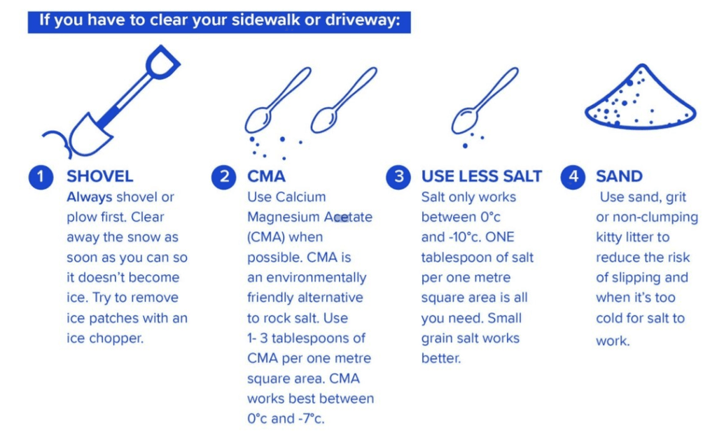 - Using rock salt to de-ice sidewalks and driveways negatively affects our lake and drinking water, and damages streetscapes and trees.