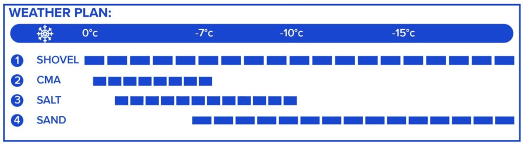 - CMA – Use Calcium Magnesium Acetate (CMA) when possible. CMA is an environmentally friendly alternative to rock salt. Use 1-3 tablespoons of CMA per one metre square area. CMA works best between 0°c and -7°c.