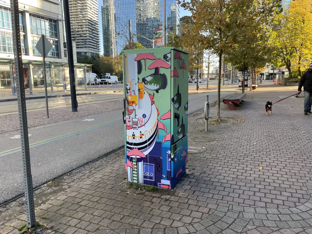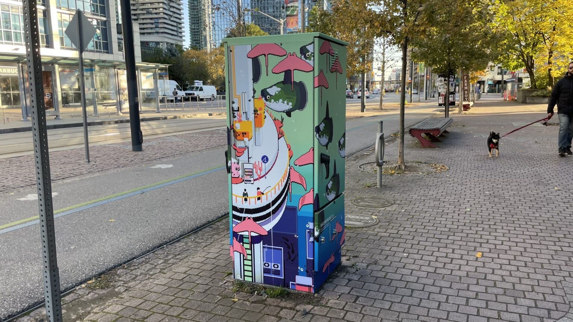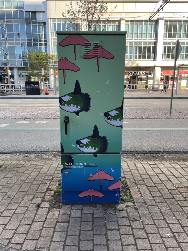 The Waterfront BIA decided to expand on Nelson’s art with a more permanent home on the streets of Toronto’s waterfront. These utility box wraps are meant to animate the waterfront and create a fun atmosphere on the streets. In addition to the pop of colour the boxes add to the BIA, the wrap is made up of anti-graffiti material that helps keep the area extra clean by making it easy to wipe away any graffiti that might appear on them.