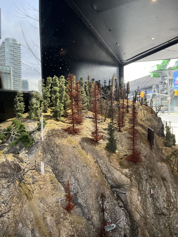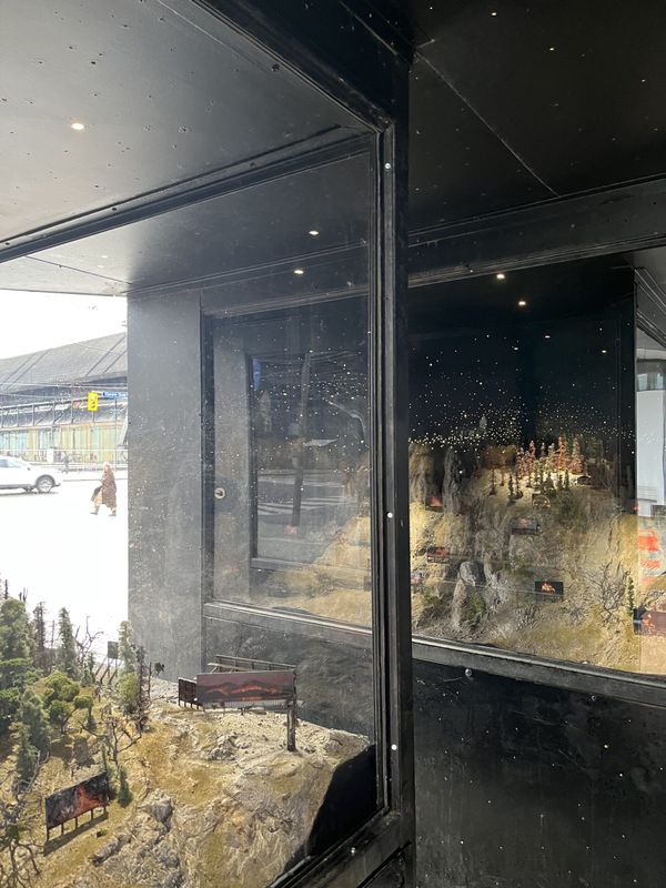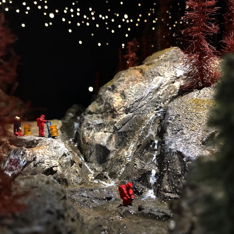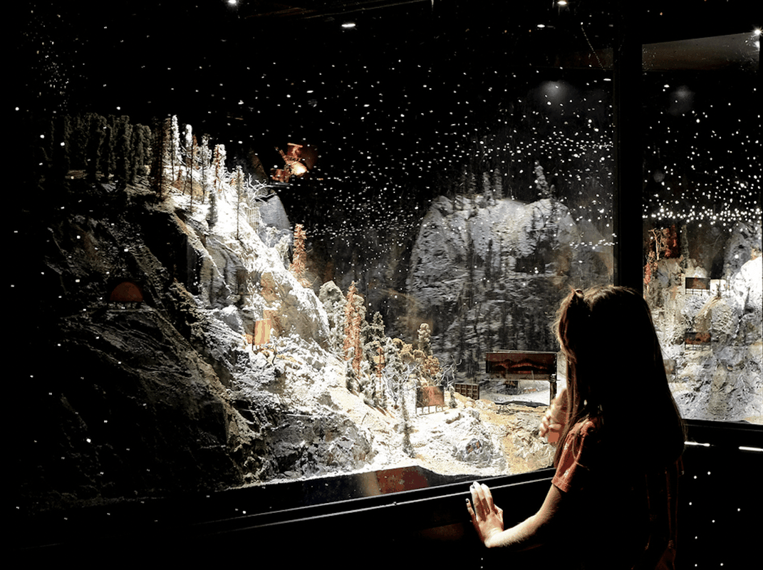 The dioramas are hand made and you can spot mountain climbers, animals, Bigfoot, and more.