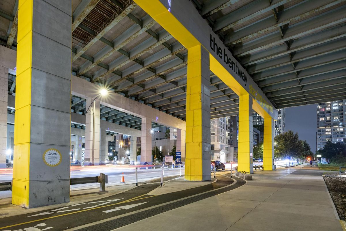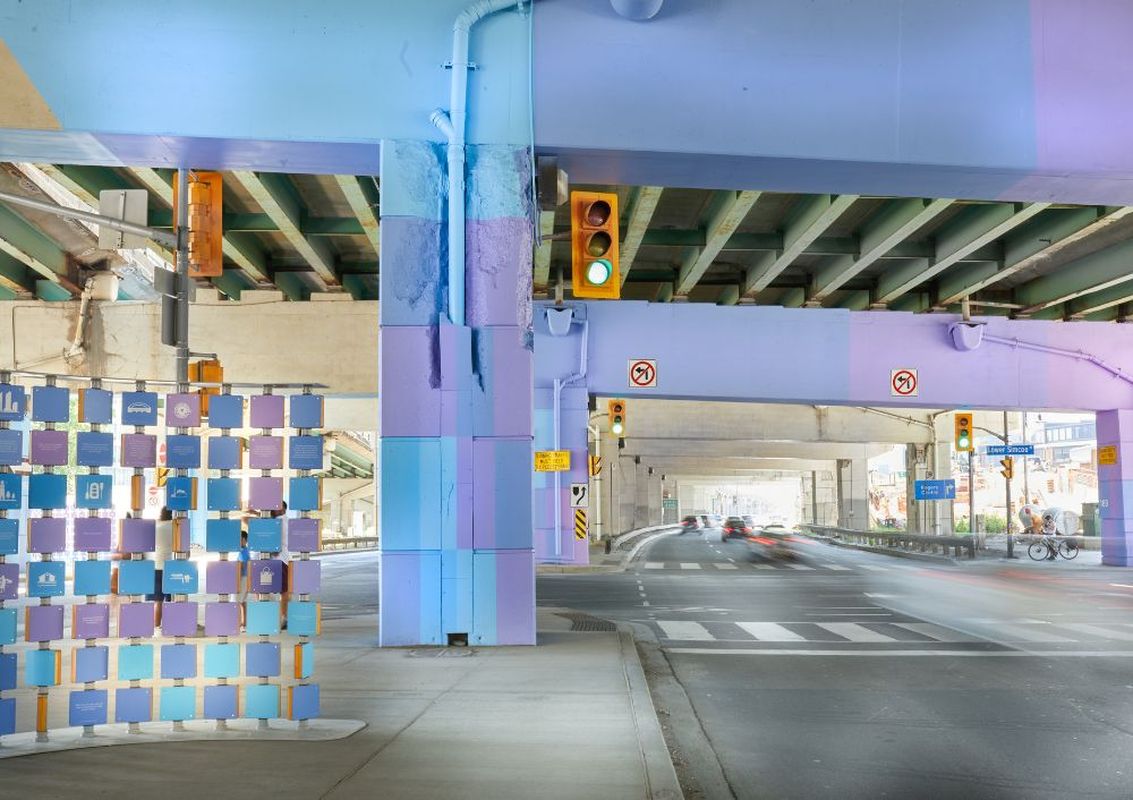 The Dan Leckie ReConnect project will utilize light cast upon the bent structures to better animate and illuminate the underpass. The Dan Leckie Way underpass is also the location of the Bentway Staging Grounds, a 2024 project by the Bentway in partnership with the Waterfront BIA to create an animated public space under the gardener at the base of Canoe Landing Park.